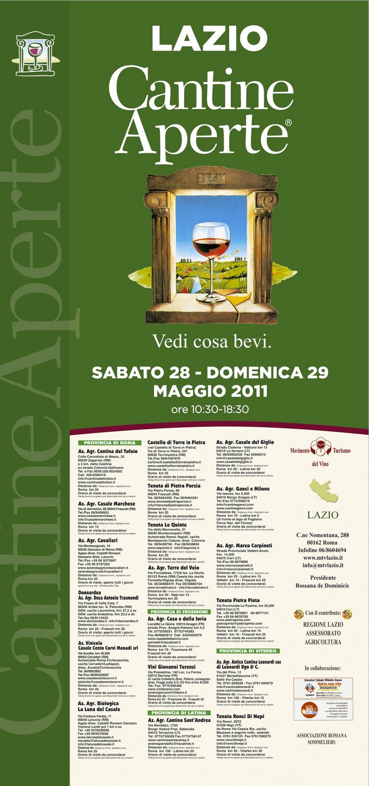 l 28-29 maggio 2011 di nuovo Cantine Aperte in tutte le regioni d’Italia e si annuncia già per le oltre 1000 cantine socie come un evento di grande rilievo;Diciassettesima edizione per il Lazio che aprirà le sue cantine agli appassionati. Il vino laziale in costante aumento di qualità e sempre più apprezzato si propone quale protagonista e motivo d’interesse per Turisti, Tour Operators, Buyers e Opinion Leaders. Tante le manifestazioni che allieteranno gli enoturisti nelle aziende, che saranno accolti come veri amici dai migliori produttori associati, guidati tra botti e gallerie, per degustare il loro vino abbinato ai prodotti tipici dell’agricoltura locale nell’Angolo Dei Sapori (Olio extravergine di oliva, Pane, salumi, formaggi, porchetta, prodotti biologici e sottolio, dolci, miele, marmellate ed altre golosità) per promuovere oltre al vino i prodotti agricoli e gastronomici dei territori della Regione Lazio, poiché la qualità e la varietà delle produzioni agricole e alimentari tipiche sono la storia del territorio e della gente che lo popola. E’ dal 1994 che il Turismo del Vino del Lazio sostiene la più grande festa regionale in onore del buon vino. Dalle testimonianze raccolte dagli enoturisti è possibile tracciare un profilo di chi è l’enoturista oggi. Un visitatore sempre più attento al territorio e alle sue bellezze, che unisce la passione del vino, alla cultura e alla tradizione del territorio che va a visitare. A tal fine anche quest’anno l’Associazione del Lazio organizza “A pranzo con il vignaiolo” (a prezzi fissi e contenuti); un evento particolare, una tavola piena di entoturisti che non si conoscono, ma che sono accomunati dalla passione per il pianeta vino e a cui i produttori offriranno per ogni piatto il vino in abbinamento.